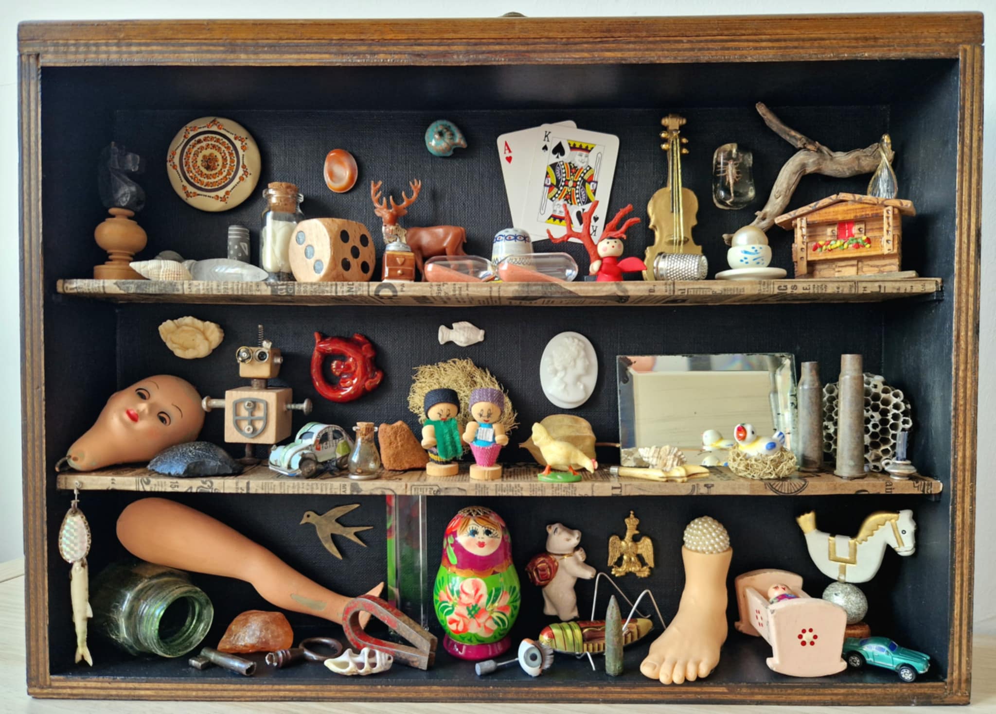 Un tiroir sauvé dans la rue, une foule d’objets fantaisistes, vintage ou improbables, une inspiration glanée sur la toile ; voici comment j’ai donné le jour à ce petit cabinet de curiosités mural. Il y a sur ces étagères quelques objets de mon enfance ; d’autres ramenés de voyages ; d’autres encore glanés, fabriqués ou réparés par moi-même ; d’autres enfin me proviennent comme d’habitude des nombreux dons de mes précieuses donatrices que je remercie encore infiniment. Les étagères elles-mêmes ont été recouvertes d’un faux-vieux journal pour fish & chips récupéré dans un pub. Comme à mon habitude, je fais feu de tout bois, surtout du bois de tiroir !